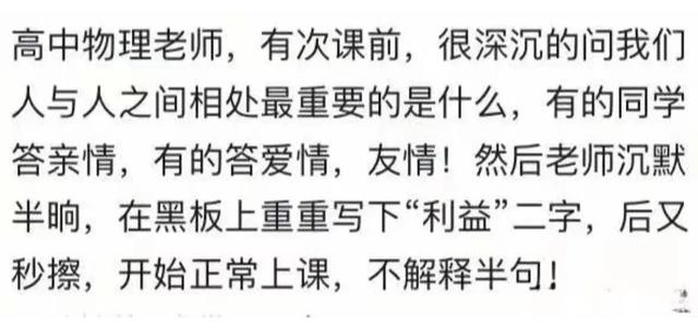 那位老师肯定是经历了利益相关的事情,又不能和学生讲,才提了这个问题。人与人之间最重要的是利益,长辈也总是这样说,除了有血缘关系的至亲会无条件爱你,其他人的好,都与利益有关,当利益不在,人与人也会逐渐断联了。